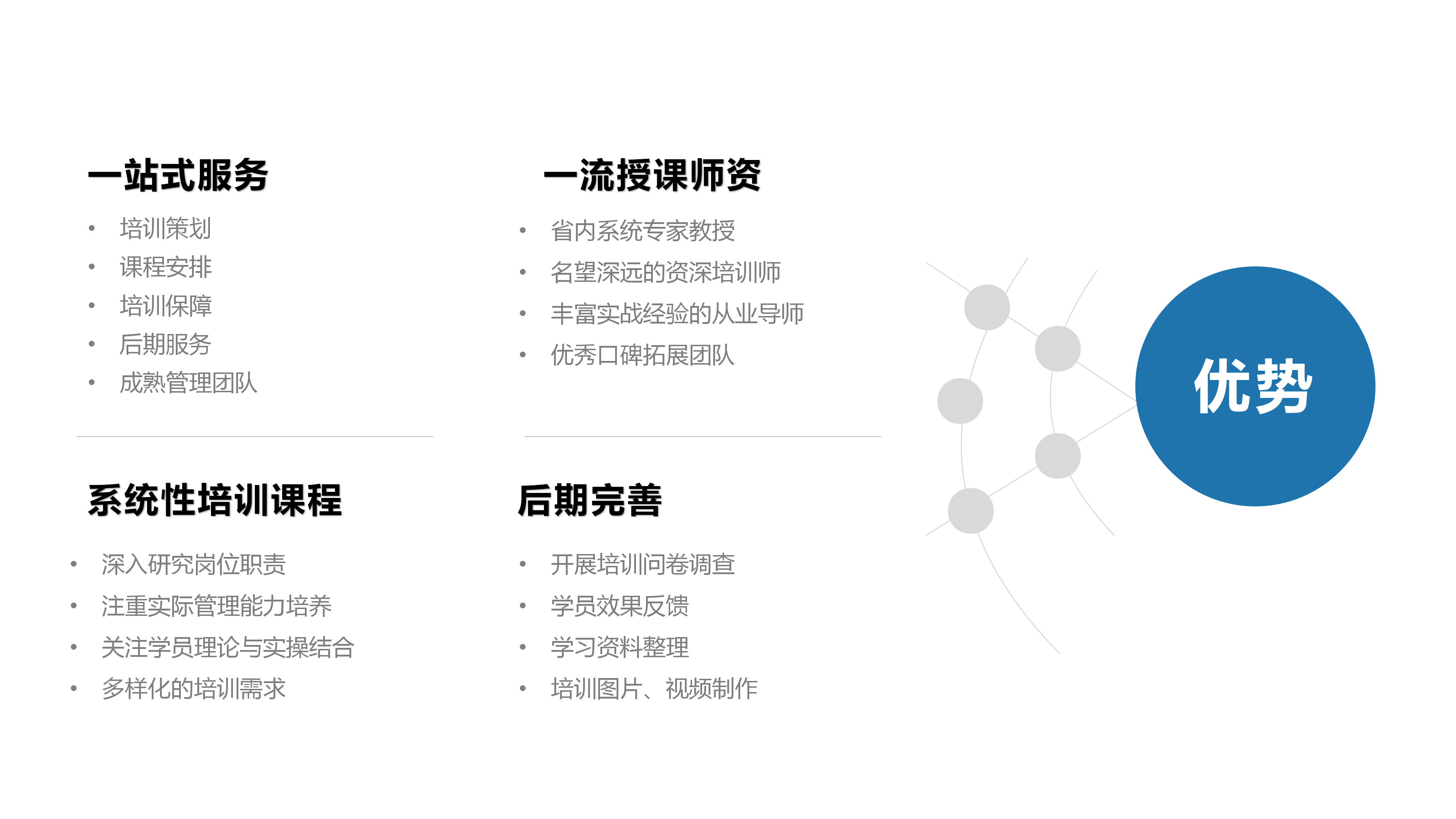 培訓(xùn)服務(wù)項(xiàng)目從制訂培訓(xùn)方案、提供會場服務(wù)、個性化課程設(shè)計、培訓(xùn)期間交通餐飲住宿整體服務(wù)、學(xué)員觀摩參觀、學(xué)員反饋、命題測試等方面不斷延伸。